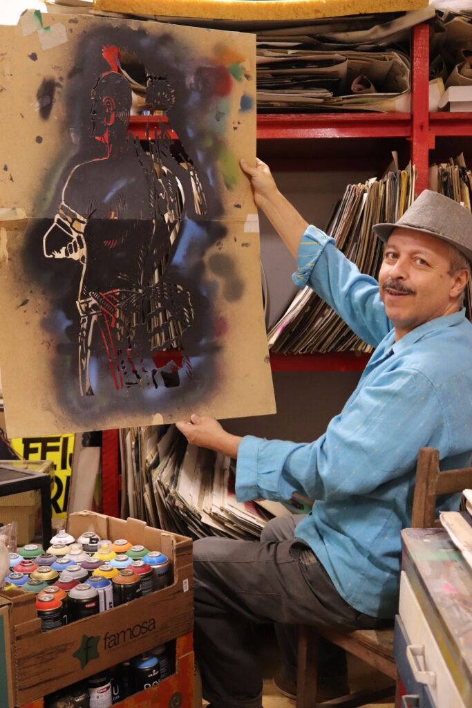 Sempre tive forte ligação com a tinta em spray, por sua praticidade, velocidade na aplicação e resultado pictórico, matrizes de estêncil que dediquei muitos anos produzindo e materiais encontrados no dia a dia como embalagens, papelão, ferro, placas de sinalização, madeira e papeis, em geral.