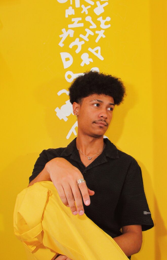 Por se tratar da minha pesquisa sobre a linguagem da escrita, acabei conhecendo e ficando fascinado pelos trabalhos de artistas como Alexandre Orion, Augusto de Campos, Luiz 83, Mira Schendel e Keith Haring. Sendo esse último a porta de entrada para minhas referências artísticas. Inspirado pelo estilo de representação simplificada das figuras humanas, descobri Keith Haring que buscou uma linguagem visual acessível e universal, criando figuras estilizadas, contornadas por linhas grossas e com cores vibrantes, o que permitia uma rápida identificação e interpretação. Esse estilo facilitou a comunicação de temas complexos — como amor, igualdade, lutas sociais e saúde pública de uma forma compreensível para o público, tanto nas ruas de Nova York quanto em galerias. Inspirado por ele, busquei, por meio de figuras simples e dinâmicas, muitas vezes em movimento, transmitir uma energia vibrante e uma sensação de conexão. Essa abordagem foi explorada em outros trabalhos pessoais, como Monóculos (des) lembrancinhas (2023), onde relaciono esses desenhos simples, quase "ingênuos", com lembranças de um passado do qual não tenho memória consciente. Minhas retomadas de memórias começaram por volta dos 9 anos, então o trabalho explora um passado esquecido, inacessível, mas que hoje posso registrar o agora e acessar futuramente por meio de monóculos fotográficos, com fotos e desenhos de figuras de palito que evocam essa infância perdida;