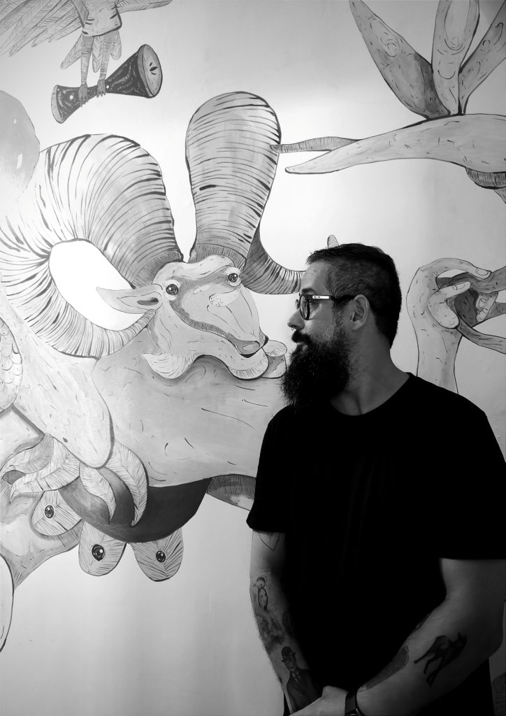 My artistic research is structured around the creation of anthropological fables, creating a particular universe of anthropomorphic bestiaries and symbols intrinsically diluted in intriguing references that move towards the sensorial and subjective through the conjunction and peculiar association of artistic techniques and metaphors that can be read, based on these chromatic, spatial and sensorial combinations, of poiesis as attempts to understand and abstract traumas and clashes that marked my childhood and the gaps in my memory. Visual manifestos that represent the relationships between the imaginary and the memories I never had. In my artistic compositions, whether in extramural art, as a form of formal and conceptual contestation and innovative artistic mapping, in paintings, illustrations, installations, and sculptures that are consolidated in a literature without drafts.