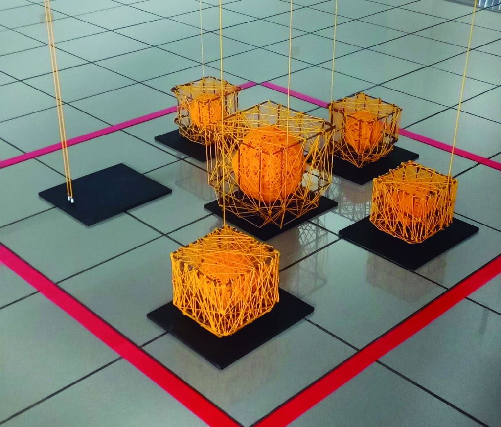 I often work with collages and assemblages. It turns out that the two-dimensional space was no longer supporting the volume that I was giving to my works. Sculpture allows me to transgress, which is inherent to the technique, of course. It is true that I often explore the wall, a two-dimensional space, as a support for these sculptures, creating a figure-background relationship that is different from what is expected. Various cardboards, packaging boxes, wood, plastic waste, hardware, threads and strings, spray paint, industrial paints, and materials preferably collected or recycled are what I currently use in the production of my works.
